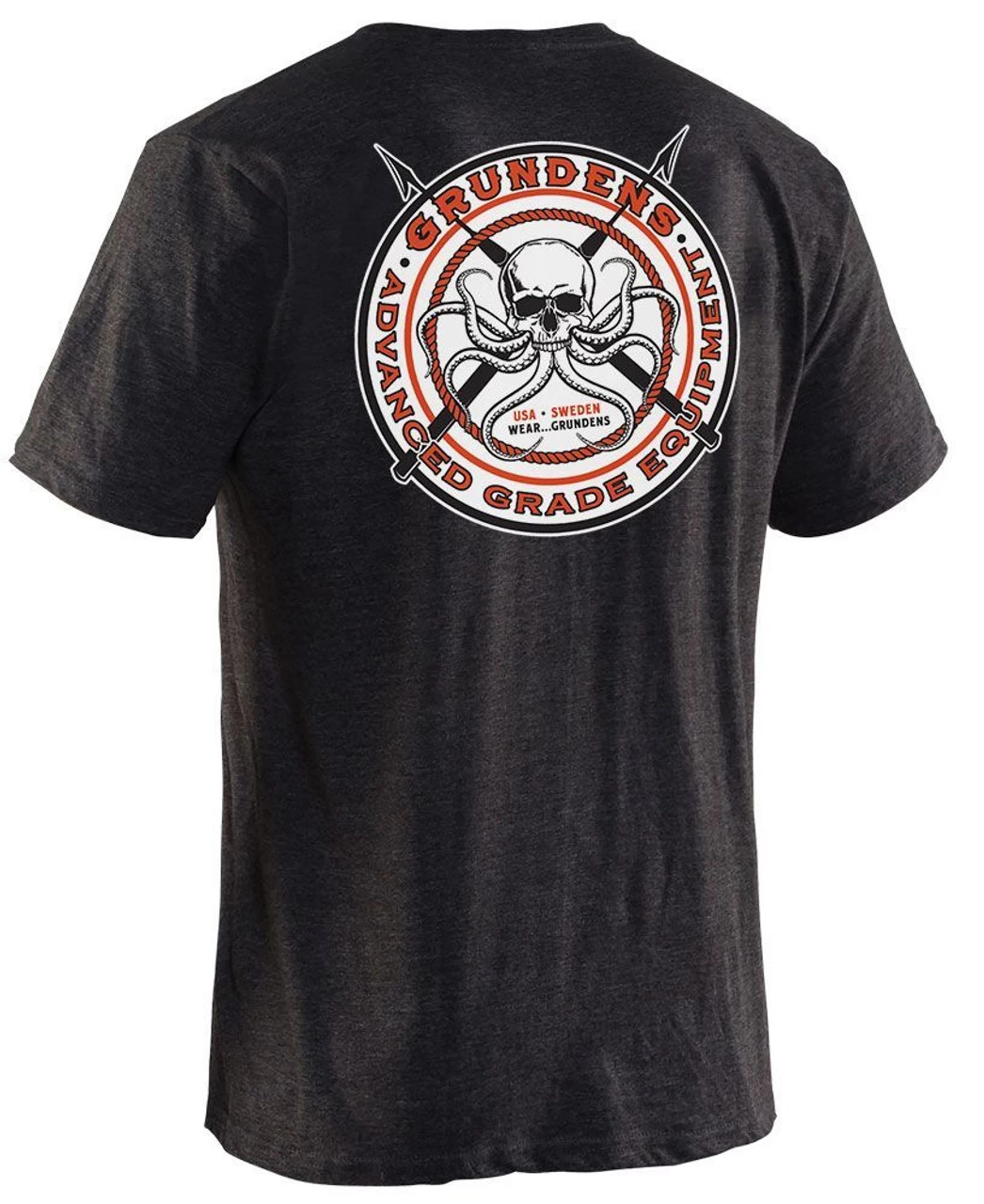 The Grundens Davy Jones Short Sleeve T-Shirt is made with a comfortable modern fit. It features a Grundens skull printed design across the back and a small version across the front.