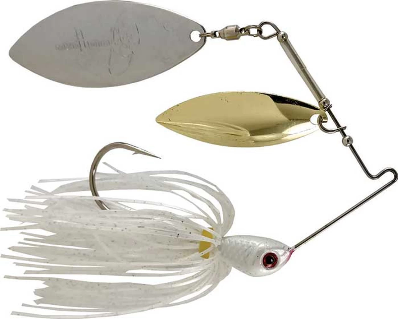Designed by bass fishing legend and spinnerbait aficionado Jimmy Houston, the Luck-E-Strike Jimmy Houston Legends DW Spinnerbait was custom designed by Jimmy himself to put big fish in the boat. These spinnerbaits utilize two oversized willow-leaf blades for a maximized display of attractive flash and vibration. Fitted with only the finest quality components, the Legends DW Spinnerbaits feature a ball bearing swivel and clevis to ensure proper blade rotation at all times, as well as a hand tied silicone rubber skirt to give the bait a lifelike body and action. A belly weighted head ensures the spinnerbait will track properly at both slow and fast speeds.