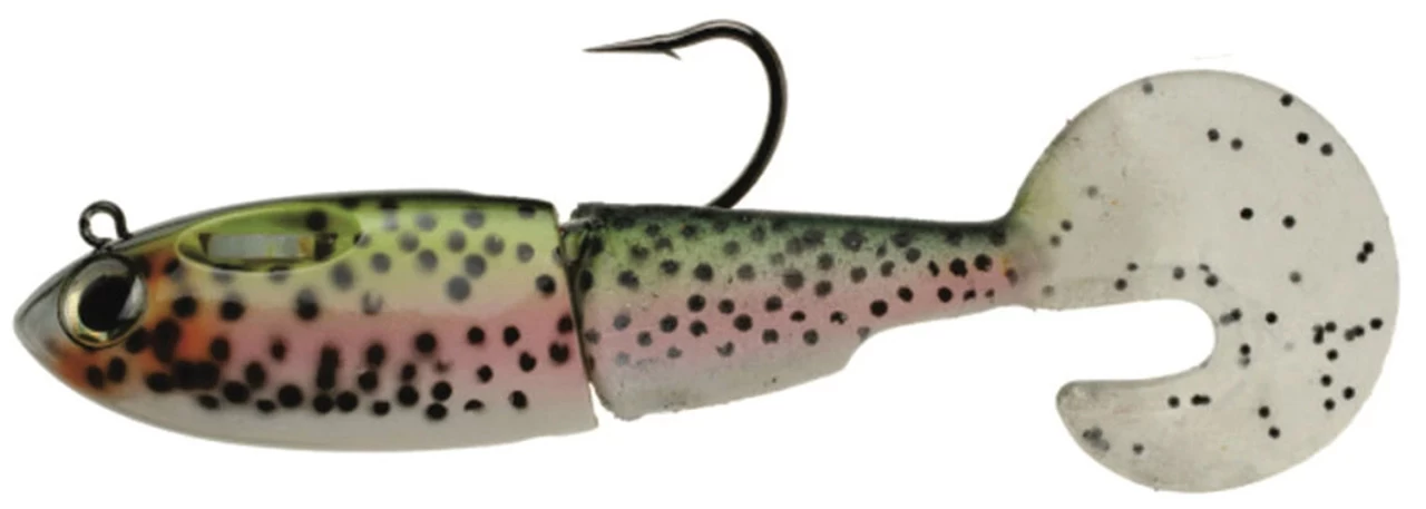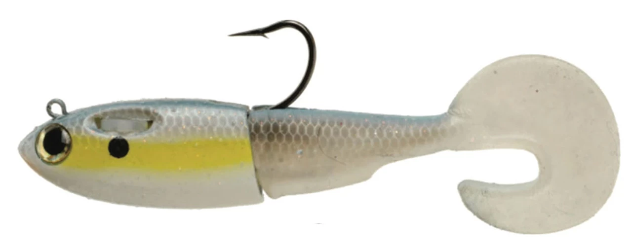 The SpoolTek Fatty Curly has a short, thick, baitfish profile designed to emulate pilchards, croakers, pinfish, finger mullet, herring, threadfin shad, gizzard shad, bunker and others. It features a curly swim tail for increased and versatile action. The lure’s most unique feature is the internal spool containing a stainless steel leader (braid for Bass colors only) that will separate from the lure when a fish strikes. This allows anglers to use lighter leaders attached to the eyelet of the lure, thus enhancing the action while preventing breakoffs due to the internal leader. It is also important to note that the hooked up fish will be unable to use the weight of the lure for leverage to throw the hook.